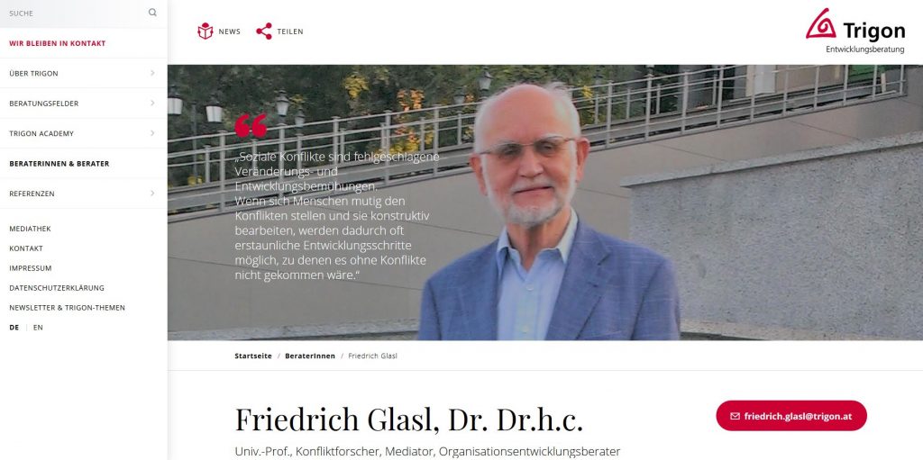 Mitgründer der Trigon Entwicklungsberatung; Autor zahlreicher Fachartikel über Führung, Organisation und Konfliktmanagement und der Standardwerke „Konfliktmanagement“, „Selbsthilfe in Konflikten“, „Dynamische Unternehmensentwicklung“; Berater, Coach und Mediator im internatonalen Einsatz